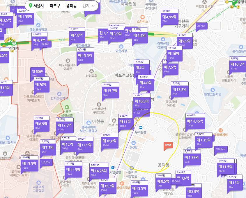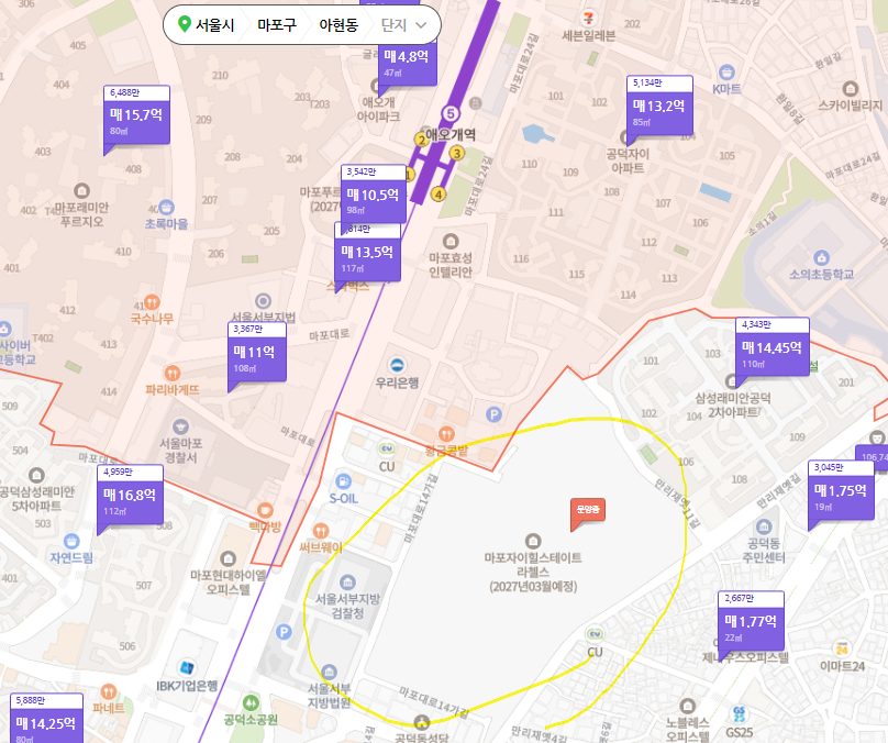 우선 2021년 최고가 기준을 제외하고 현재 마포자이힐스테이트 라첼스 주변의 신축 아파트 중심으로 매물을 비교해보았습니다.