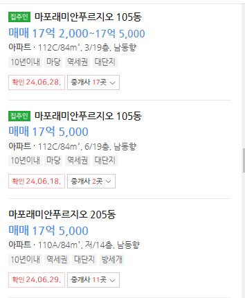 2014년에 지어진 3천 세대 이상의 대단지인 마포래미안푸르지오 아파트의 현재 네이버 부동산에 올라온 매물입니다. 84제곱미터 기준으로 최저 매물부터 조회했을 때 가장 낮은 매물은 17억 초반 대입니다.