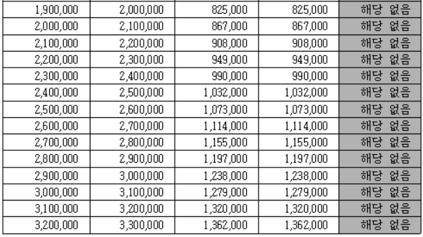 가구의 연간 총 급여액을 기준으로 단독가구, 홑벌이 가구, 맞벌이 가구에 따른 근로장려금 금액입니다.
